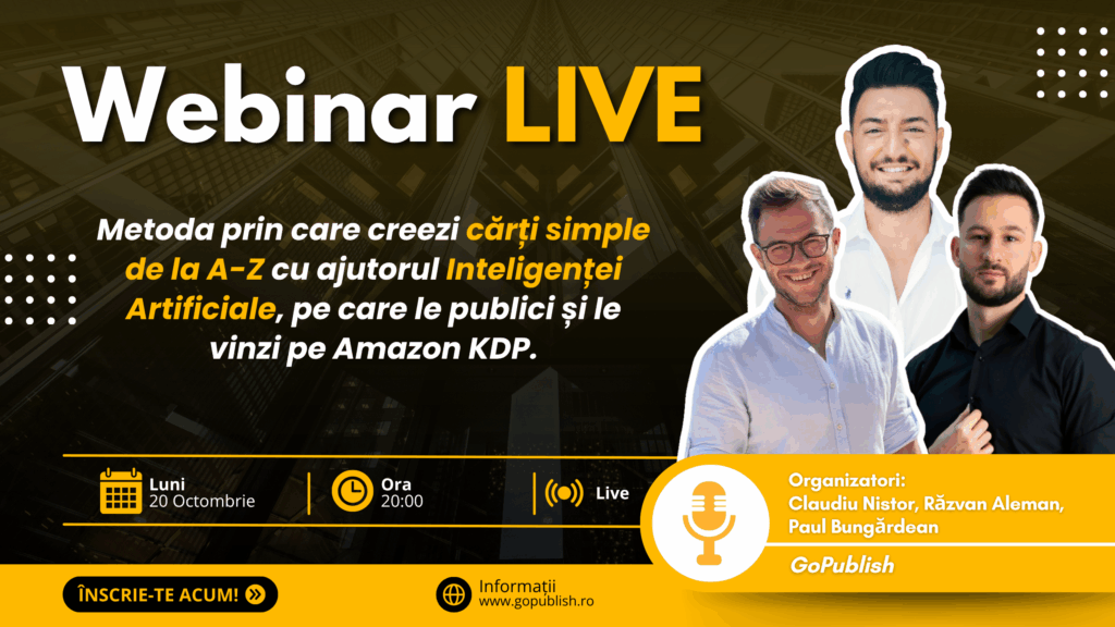 Așadar, îți urăm ”Bine ai venit!” la un webinar online liveTOTAL GRATUIT în care îți arătăm metoda prin care poți crea cărți simple cu ajutorul Inteligenței Artificiale, pe care să le publici și să le vinzi pe Amazon, pentru a face vânzări lună de lună!