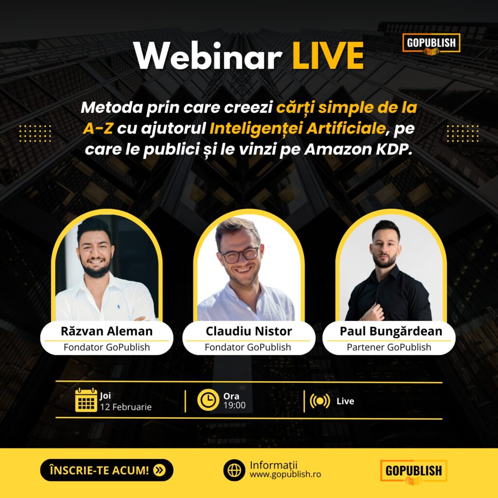 Da. Amazon KDP este disponibil internațional. Poți publica și vinde de oriunde și poți încasa veniturile în contul tău bancar indiferent de țara în care locuiești. Webinarul este online și vei primi acces printr-un link după înscriere.